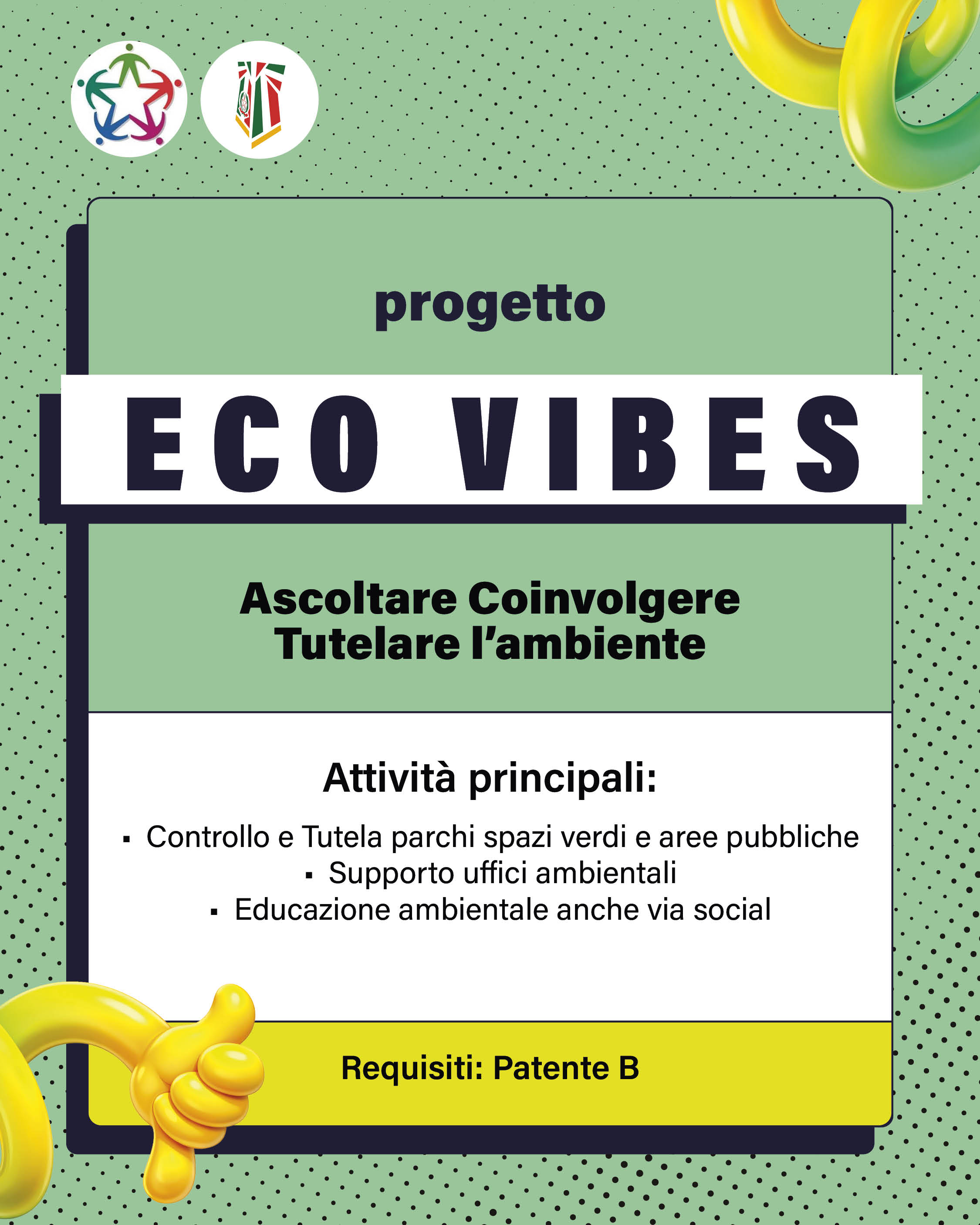 È possibile fare il Servizio Civile Universale presso l’ufficio LAVORI PUBBLICI, MANUTENZIONI, AMBIENTE aderendo al progetto ECO Vibes - Ascoltare Coinvolgere Tutelare